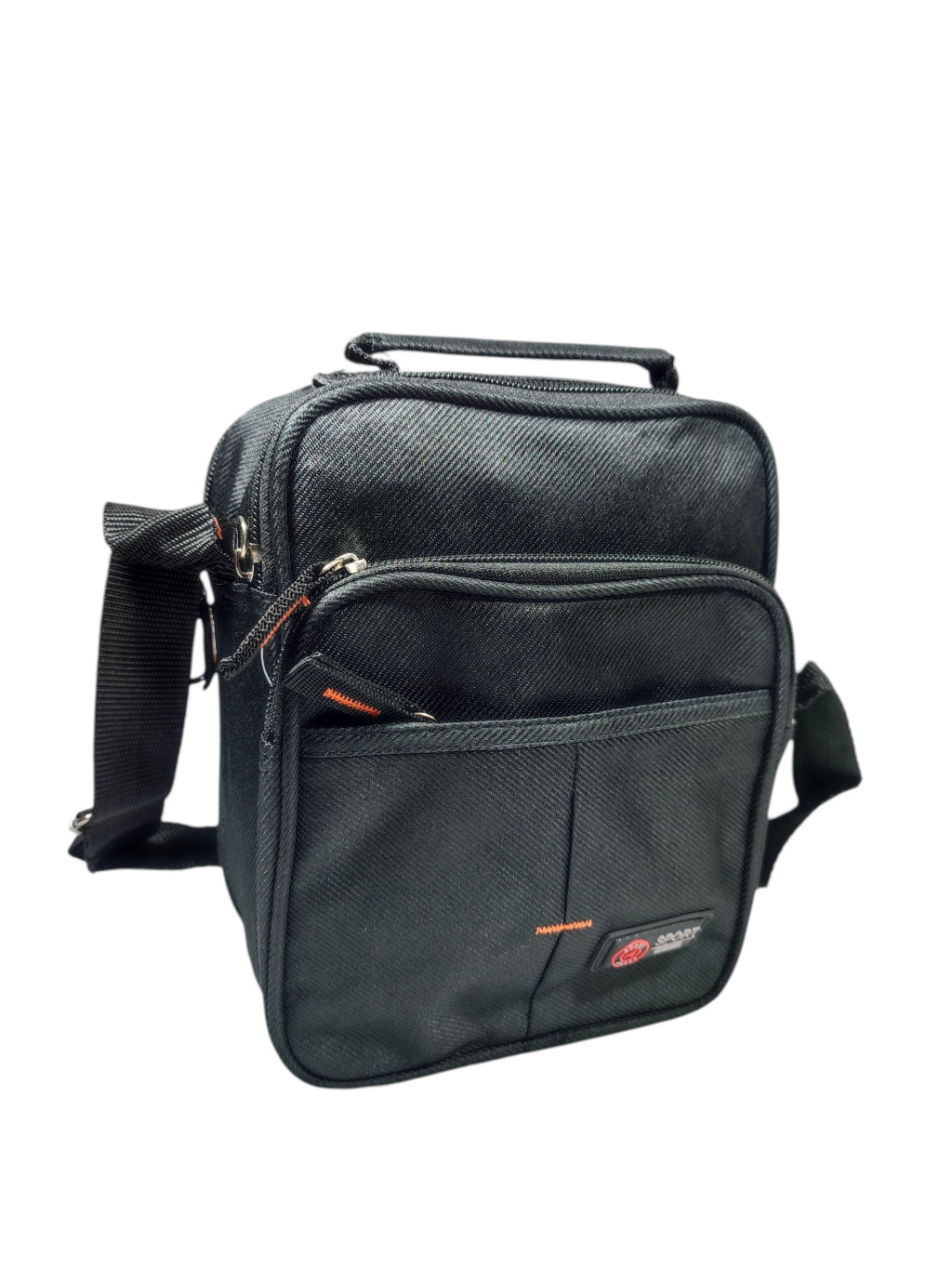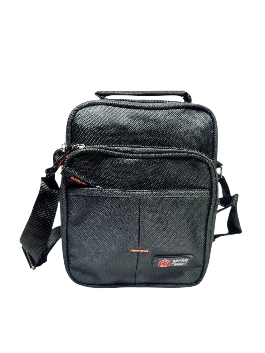 Kisméretű férfi fekete oldaltáska kettő cipzáras rekesszel, és elején kettő cipzárral zárható zsebbel.